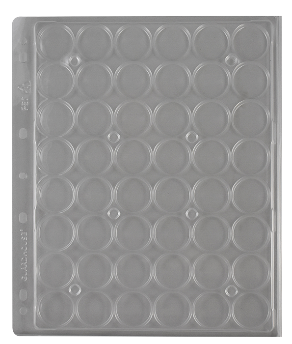 (PET Vac Form) Holds 48 Small Guardhouse coin capsules and Model A Air-Tite coin capsules. Clamshell pages for the storage and display of coin capsules in notebook binders. Hole punched and designed to work with either 3-ring or 4-ring 9x12 oversized binders. Dimensions: 9 1/4 x 11 3/8" (240 x 282 mm).
