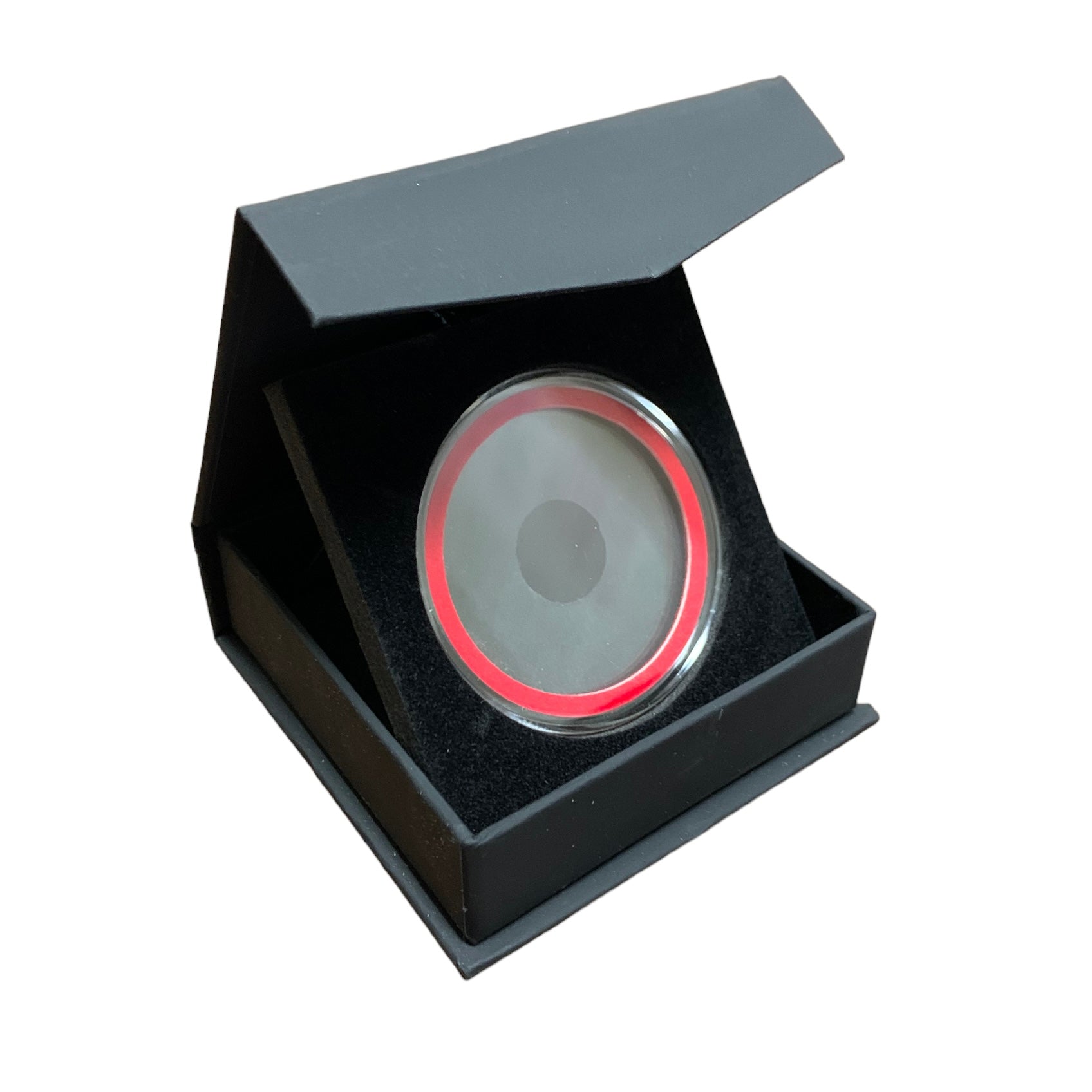This is a combo pack that includes a guardhouse folding coin box XL for a Model I holder. Also includes a Model I 40 mm coin holder with your choice of a Red, Blue or Green velour ring. 40mm capsule will accommodate an American Silver Eagle.